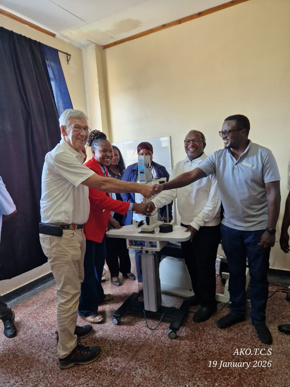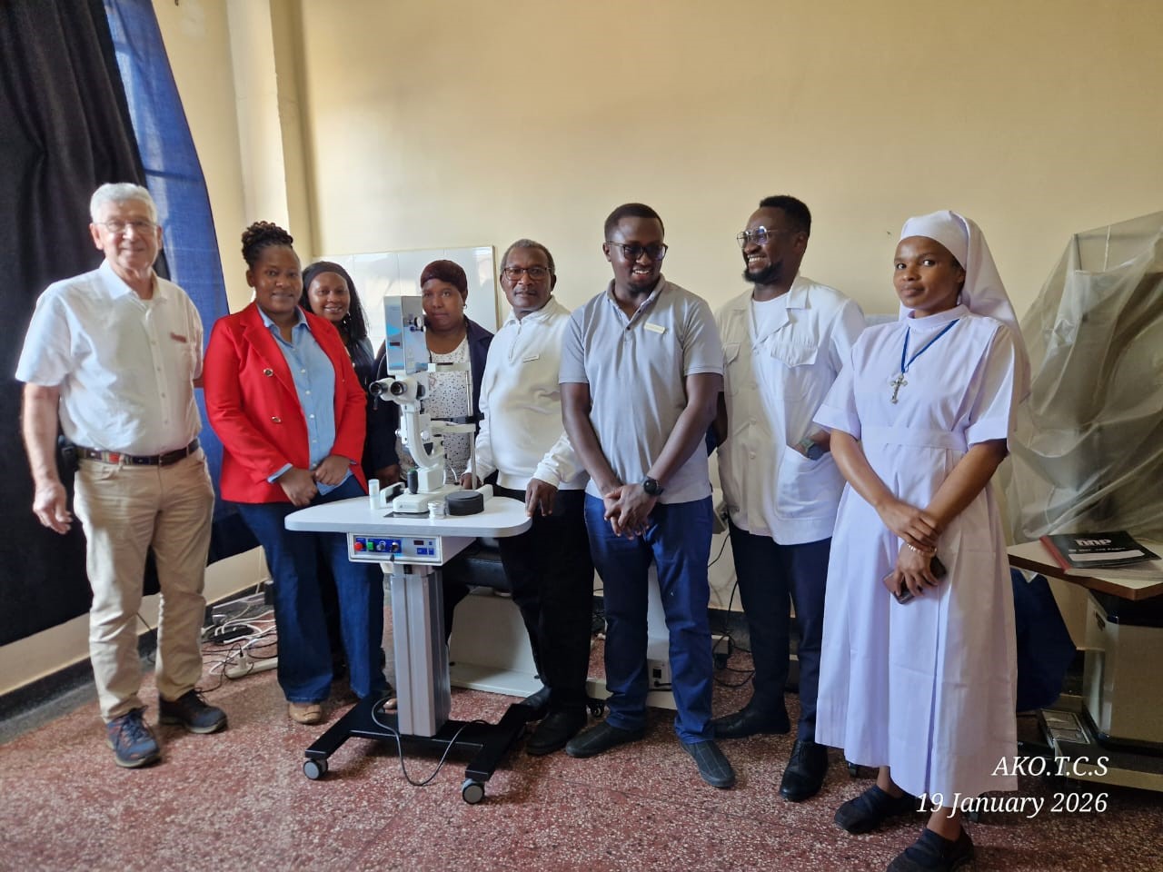 An der Übergabe und Einführung des Geräts nahmen mehrere Beteiligte teil, darunter Dr. Edwin, der künftig mit dem SLT-Laser arbeiten wird, Franziska Boemer sowie Dr. Hans-Joachim Miertsch. Ebenfalls anwesend war Christian Mlundwa, Leiter der Augenklinik Kibosho, der den neuen SLT-Laser gemeinsam mit dem Klinikteam entgegennahm.